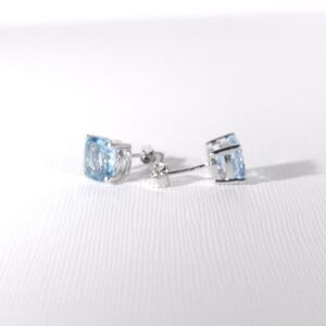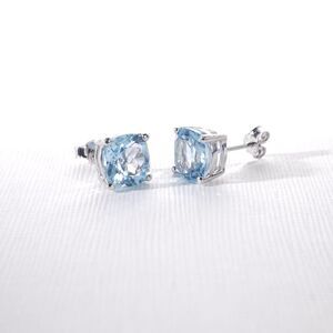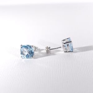 The topaz gemstones are 8 mm cushion cut and faceted for flash.