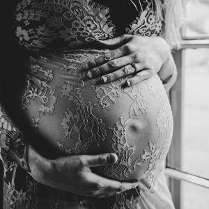 Sky blue lace maternity dress, floor length, stretchy material, "one size" which fits like a medium, but is stretchy material so can work well on a few different body sizes.