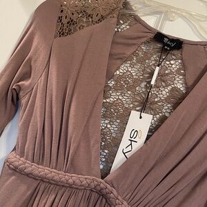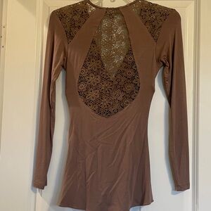 Chic brown top with lace accents. Long sleeves and elegant design.