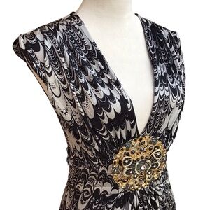 This beautiful Sky mini dress is perfect for any occasion and will make you feel confident and elegant. The dress features a stunning butterfly embellishment and a flattering V-neckline. It is a size small and is ideal for women who want to show off their curves.