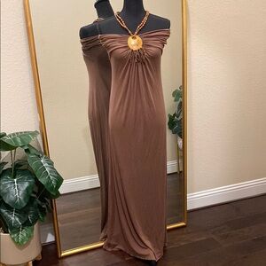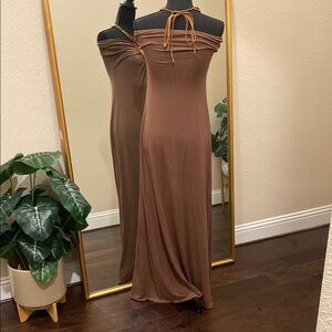 Sky Embellished Ruched Brown Off-Shoulder Halter Gown Size L