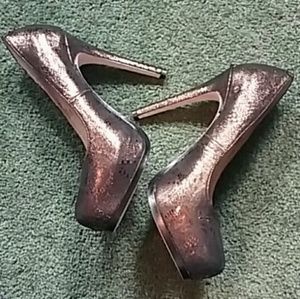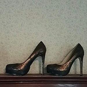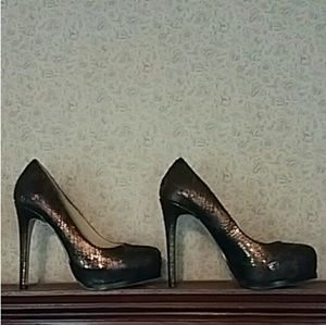 Super sexy, very comfortable all leather Chinese Laundry platform heels size 8 M. Shimmery metallic bronze snakeskin pattern, hard to capture, but so much more beautiful in person. Leather upper, leather lining, leather sole. Cushioned footbed, covered 1" platform, 5" heel. I, myself, have these in 2 different colors, and they truly are sooo comfortable. New in box. And when you open the box you get that delicious new leather smell :)