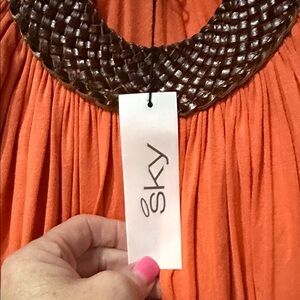 Stylish orange top with braided straps, perfect for any occasion. Comfortable and chic, this top adds a pop of color to your wardrobe. Material is rayon and spandex with leather detailing