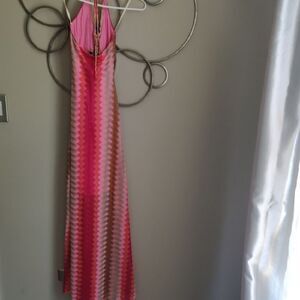 Chic maxi dress by SKY with vibrant pink and brown zigzag pattern. Perfect for a stylish outing. Flattering halter style. Excellent pre-loved condition...no signs of wear. Size XS