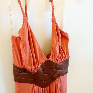 Gorgeous and classy coral maxi dress with fitted bust, braided halter top, and faux brown leather braided waist band. Comfortable in any setting.