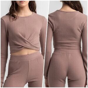 New with tags women’s Sky & Sparrow Tilly’s taupe casual cozy waffle knit thermal cropped top and flare leg pull-on pant matching set. Top features front cross wrap detail.