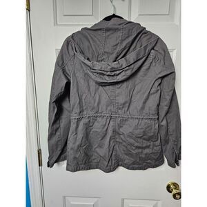 Sky and Sparrow size medium military style jacket Gray has a hood pit to pit measures 19 inches shoulder to hem 23 inches drawstring waist number is i36