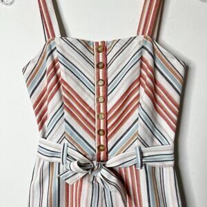 Sky and Sparrow Women's Romper S Linen Button Front Mitered Waist Tie Sleeveless