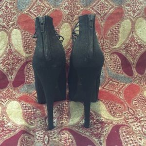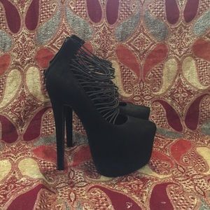 Black 6 inch platform pumps with strappy caged detail front. Zipper in the back for easy on/off. Never been worn. True to size.