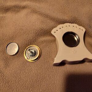 This Skye McGhie Cream Lace Fine Porcelain Clock is 3 inches high, is a 2004 Cream Lace collection, needs a battery, and I show in the pictures how to do that. If you have any questions please email me Thanks for looking!!