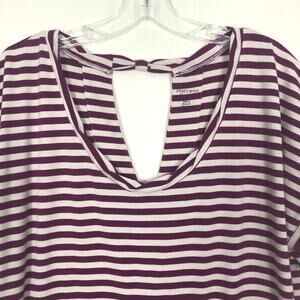 Women's striped top in purple and white. Scoop neck. Folded short dolman sleeves. Cut out in back with bow accent. Faux wrap accent in back. Banded bottom hem. Moderate pilling. In good used condition. No stains, tears or holles.
