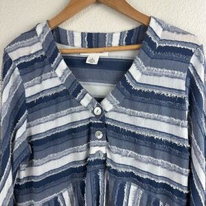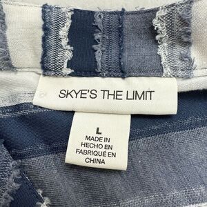 Sky’s The Limit V-Neck Blue Stripe Shirt Size L. Button tabs on sleeves, 3 button front. See pics for care tags and approximate measurements.