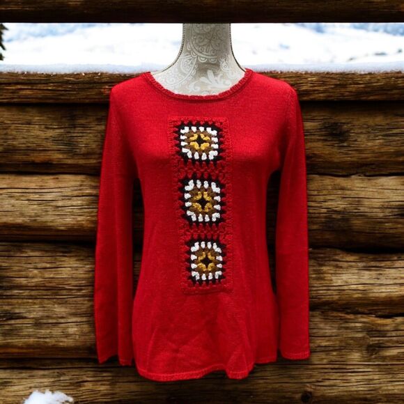 Skye's The Limit Women's Sz M Red Pullover sweater Tunic granny squares accent