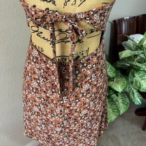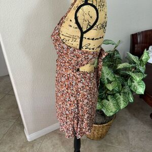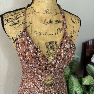 This Skylar + Madison floral halter dress is a must-have for any wardrobe! Featuring a beautiful burnt orange base with a dainty floral pattern, this dress includes a trendy front cutout and button-down detail for a flattering silhouette. The halter neck ties in the back, adding a chic and comfortable fit. Perfect for summer outings, festivals, or a casual day out, this dress offers a stylish and feminine look. Made from soft, breathable fabric, it’s as comfortable as it is cute! In excellent, pre-loved condition with no signs of wear.