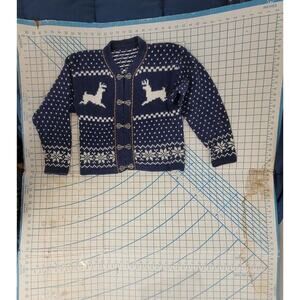 This vintage Skyr cardigan sweater jacket showcases a classic Nordic Fair Isle design with charming reindeer motifs, perfect for adding a touch of cozy heritage style to your wardrobe. Featuring metal toggle closures and a warm knit construction, this timeless piece offers both comfort and rustic charm. Ideal for layering during colder months, it brings a vintage winter aesthetic to any outfit.
