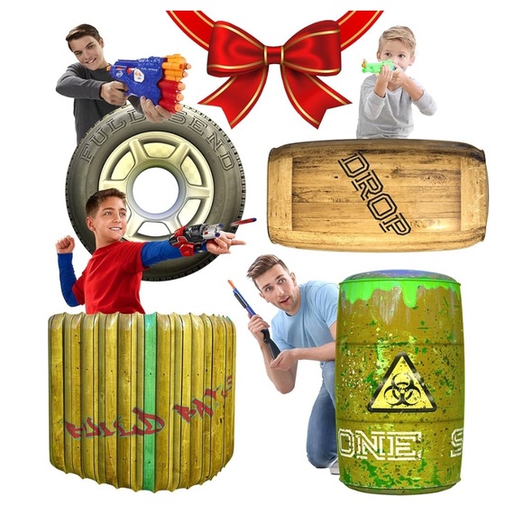 Fun inflatable battle zone set with various designs. Includes tire, barrel, and crate shapes. Perfect for outdoor play. 4 pieces.