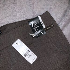 Gray, brand new, never worn slacks with zipper detail at waist. Pockets have not even been slit yet. Regular tags attached