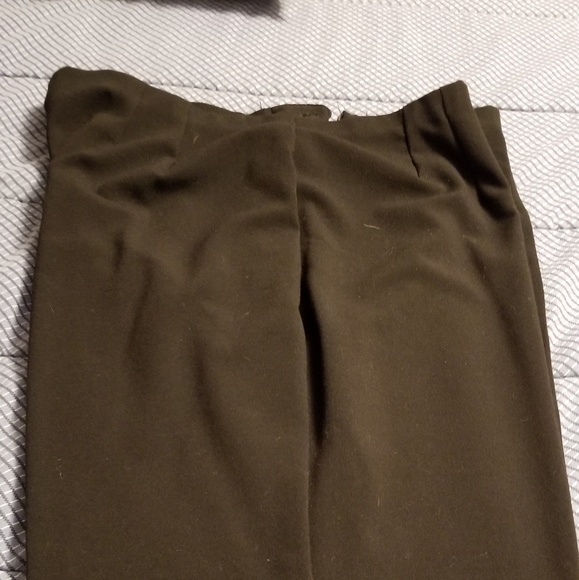 Black slacks, side zipper, no waistband.