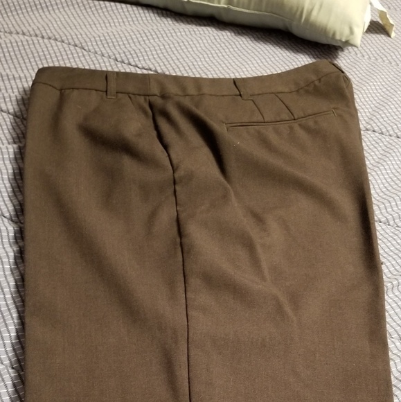 Dark gray slacks, belt loops and rear pockets.