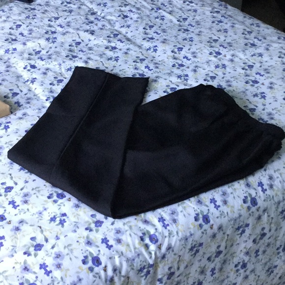 Slimming slacks, elastic waist, polyester, rayon and spandex in slimming panel. Slash side pockets.