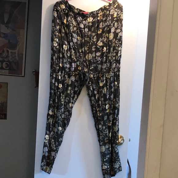 100% Rayon slacks. Green with yellow & violet floral pattern. Pockets. Would look great with dress shoes or sandals.