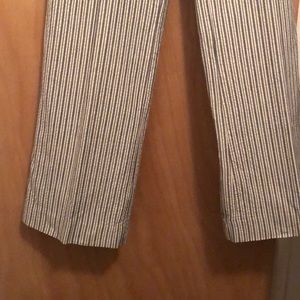 Blue and white seersucker slacks with front and back pockets , self -fabric decorative belt , wider -legged slack.