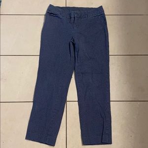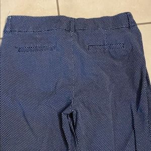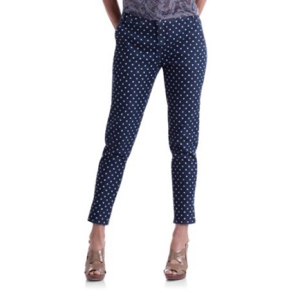 Navy blue slacks with white polka dots. Straight legged. Stretchy comfortable fabric. The slacks are the same fit and color as the ones pictured, but the polka dots are smaller.