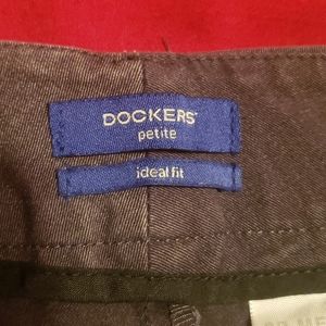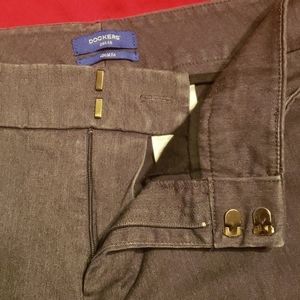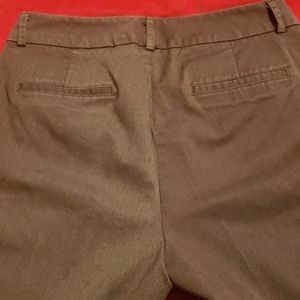 Dark gray dress slacks. 2 real pockets in front, 2 mock pockets in back. Belt loops clasp, button zip front closure. Cotton/polyester blend