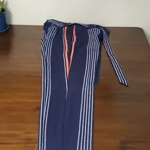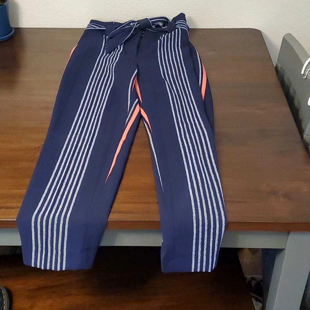 slack material so best for formal business. mid to high waist with tie around waist. has pockets. aren't too loose around butt or legs. very flattering. ankle length for regular length size. Pairs extremely well with white blouse I have posted. can bundle other stuff I have posted for discount.