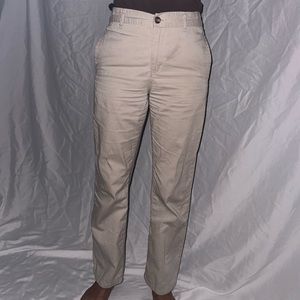 Beige or light khaki colored slacks. Nice formal dress pants. Waist can be adjusted with buttons on the inner band to slightly loosen or tighten as pictures. Labeled size 12 (girls I believe) but pictured on size 24/size 0. Ideal for size 23/24. Slight pen mark on pant leg