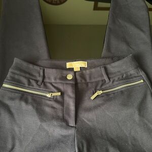 Dark blue slacks, silver zippers , no tears, rips.