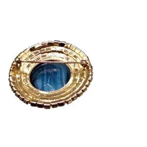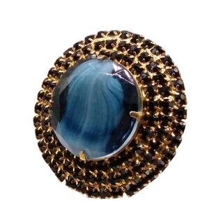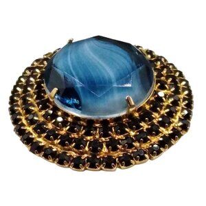 Slag Glass Brooch in Ocean Blue with Triple Prong Set Black Crystal Halo, Vintag