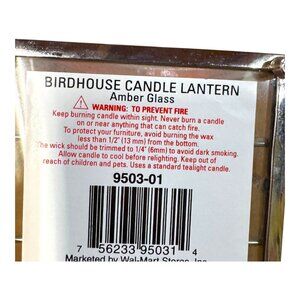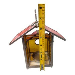 Elevate home ambiance with this charming birdhouse-inspired lantern. Its amber glass and red stained roof create warm, inviting light. A unique decor piece.
