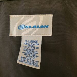 In great condition, 100% nylon shell, lined, adjustable elastic straps, zipper pockets, zipper and snap closure, 15" flat waist, 29" inseam