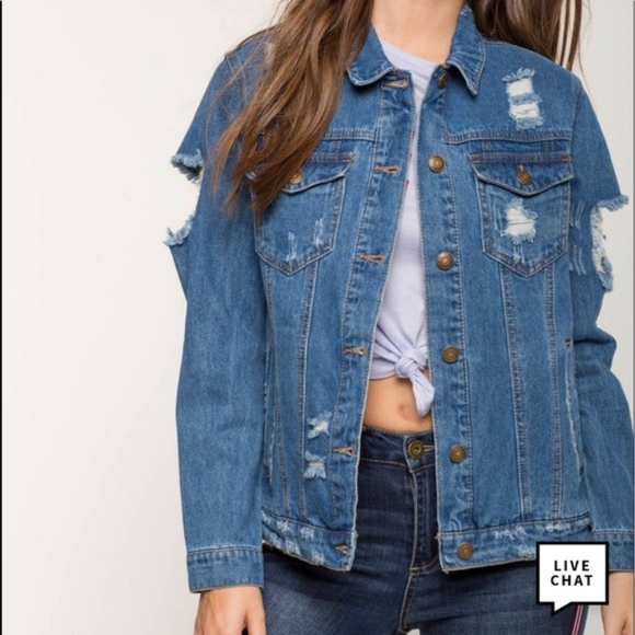Show off your edgy side in this slasher denim jacket. It features trendy distressed detail, front button closure and side pockets. Long sleeves. Chest patch pocket. Classic collar. Slight stretch material.