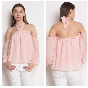 Gorgeous blue slate long sleeve button up blouse features bell sleeves sleeves and ruffled hem. Lightweight rayon. Ruffled neckline and button down area. Small bust 40", length 29". Medium bust 44", length 30". NWT boutique item.