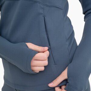 This active top is extremely soft and buttery to the touch. This Slate Blue mock neck features an all-over ribbed jacquard construction for a unique look, long sleeves with thumbholes to keep your wrists warm, and zippered side pockets. The half-length zipper goes up into a high neck for extra warmth while the body features paneling for a slim and sleek fit.