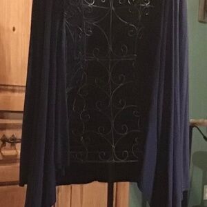 I must admit my little iron mannequin is not built like a human! This is a Slate blue colored swag topper that falls a little better on a real person. It is beautiful, feels like velvet meets silk. The back length is 28.5” and it flows downward on the sides to 36”. New without tags, never worn and in excellent condition. These are so cute with lace camis and boots.