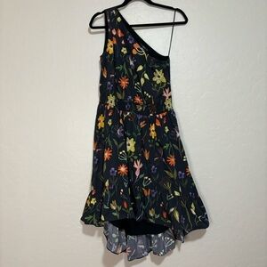 This dress is in great condition! Black with vibrant multi-color print, one-shoulder, smocked waistband. Ruffled hi-low hem, fully lined. Hidden side zip. So feminine and flattering!