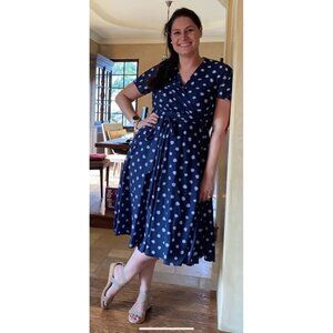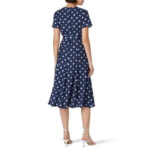 Navy ditsy floral printed crepe (100% Polyester). Wrap dress. Short sleeves. N-neckline. Partially lined. 45" from shoulder to hemline. Imported.