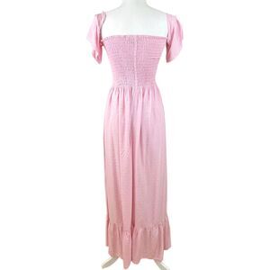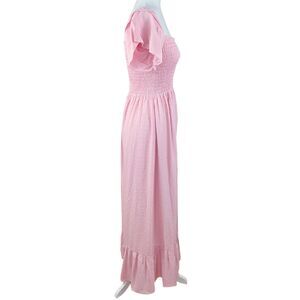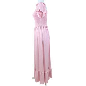 Slate & Willow Delicate Pink Maxi Dress Size M Shirred Bodice Off-the-Shoulder. Dress is in good preowned condition. Lightweight Swiss dot rayon fabric. Shirred bodice. Attached short sleeves drape over arms. Long skirt with ruffle flounce hemline. Skirt is lined.