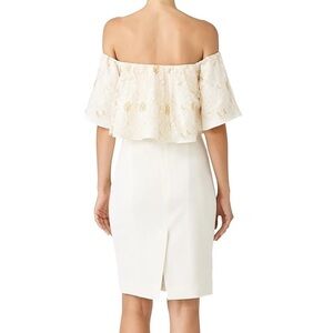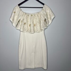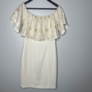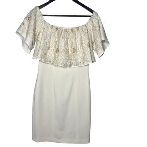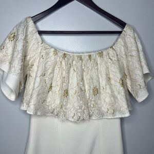 Sheath with gold lace ruffle popover. Short sleeves. Off the shoulder neckline. Hidden back zipper. Partially lined. Fitted through midsection. Comfortable room at bust. knee length.