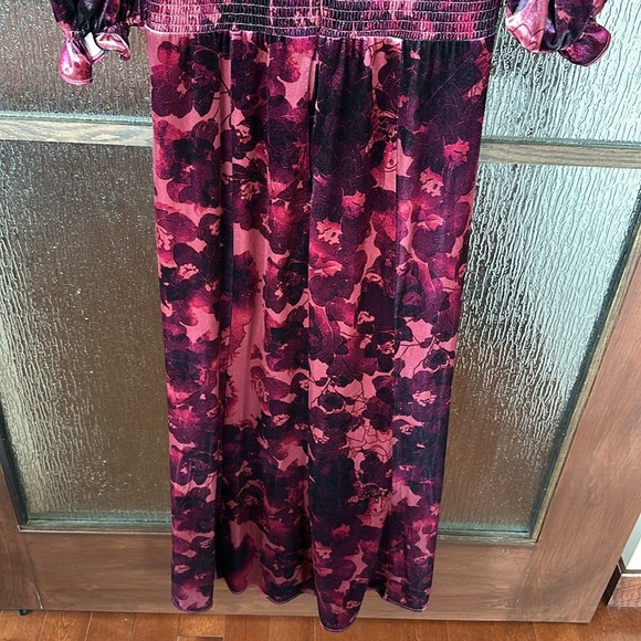 Pink Merlot floral velvet (95% Polyester, 5% Spandex). Hourglass. Short sleeves. V-neck. Back zipper closure. 55" from shoulder to hemline. 14" slit. Imported.