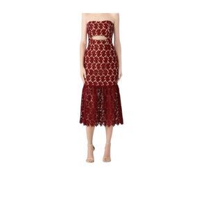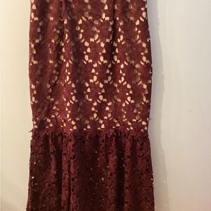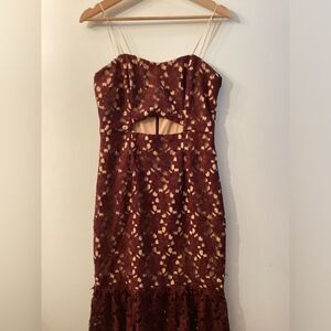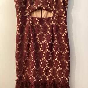 Stunning burgundy lace dress with a strapless design. Features a unique cutout detail and a flared hem.