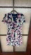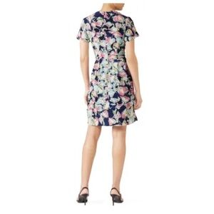 Blue printed crepe de chine (100% Silk). Hourglass. Short sleeves. V-neckline. Exposed back zipper closure. Fully lined. 37.5" from shoulder to hemline. Imported.