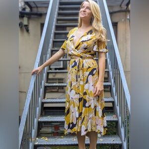 Embrace elegance with this stunning floral yellow wrap dress. Perfect for any occasion, this dress combines style and comfort effortlessly.