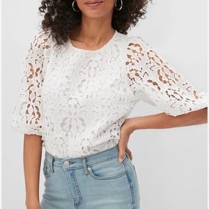Feminine slate blue top from Banana Republic. Short sleeve with lace detailing. Scoop neck. Worn once. Perfect condition.