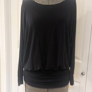 Sized as a Small although this garment can fit a variety of sizes due to its material and loose/Slouchy upper and stretchy touched bottom. The touched area feels great and looks flattering around the abdomen and backside. You can wear this slightly off shoulder if you want and you can wear the touched area expanded or scrunched smaller. Fabric doesn't wrinkle and flows so nice. Great travel item. Material 93% micromodal 7% Lycra. Let me know if you have any questions!