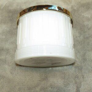 Container = Custom glass w/embossed piano key design, goldtone metal lid w/Elton monogram