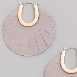 The perfect accessory to slay any look is the Paris & Pearle Slay Girl Gray Vegan Leather Earrings! Half circle vegan leather charm featuring a semi-circle design , and trimmed with slits that dangle from gold loops with a post back measuring 2"